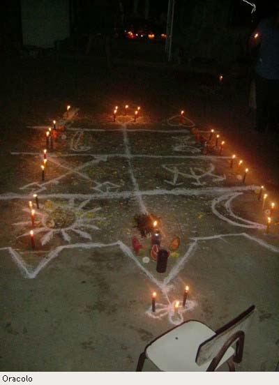 Risposta: il disegno che facciamo a terra (n.d.r. denominato “oracolo”) durante una velacion nasce da una serie di osservazioni che partono dalla persona che deve fare la velacion, dal tipo di malattia o malessere se si tratta di una guarigione, dalla cosa che si vuole propiziare se la persona ha bisogno di attrarre qualcosa nella propria vita, da ciò che gli spiriti suggerisco di fare durante la sua composizione. Durante il disegno dell’oracolo ci poniamo attorno allo spazio fumando il sigaro per chiedere appunto dei messaggi su cosa deve essere fatto o richiamato nel disegno che poi componiamo col talco a terra. Spesso gli spiriti ci dicono come comporre la figura dell’oracolo, quali simboli disegnare, quali coorti richiamare in funzione del risultato che si vuole ottenere. Se ad esempio una persona ha bisogno di protezione da parte della Chiesa e di una guarigione poniamo nel disegno i simboli che richiameranno l’intercessione della Coorte Ecclesiastica e della Coorte Medica. Se aggiungiamo semi, frutti e fiori è per richiamare la fertilità, la prosperità, l’abbondanza, il rifiorire del corpo e dell’anima a nuova vita.